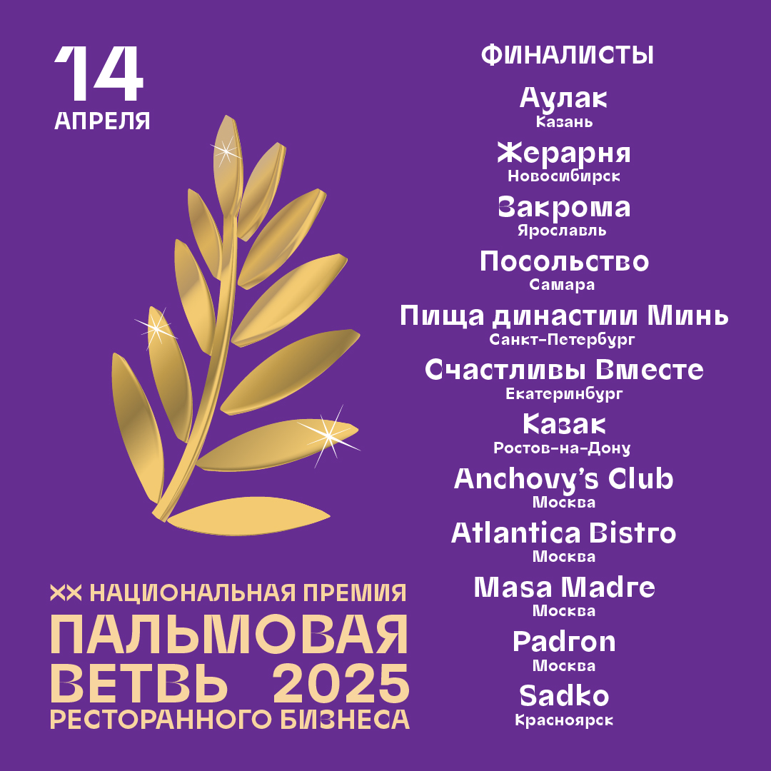 | Финал премии состоится 14 апреля в столичном Moscow Marriott Imperial Plaza в присутствии 500 представителей элиты ресторанного рынка России. И за статус «золотой» ресторанной концепции в этом году сразятся оригинальные и креативные проекты, открытые в 2024-м, из 9-ти регионов страны – Москвы, Санкт-Петербурга, Екатеринбурга, Новосибирска, Самары, Красноярска, Ярославля, Ростова-на-Дону и Казани. |