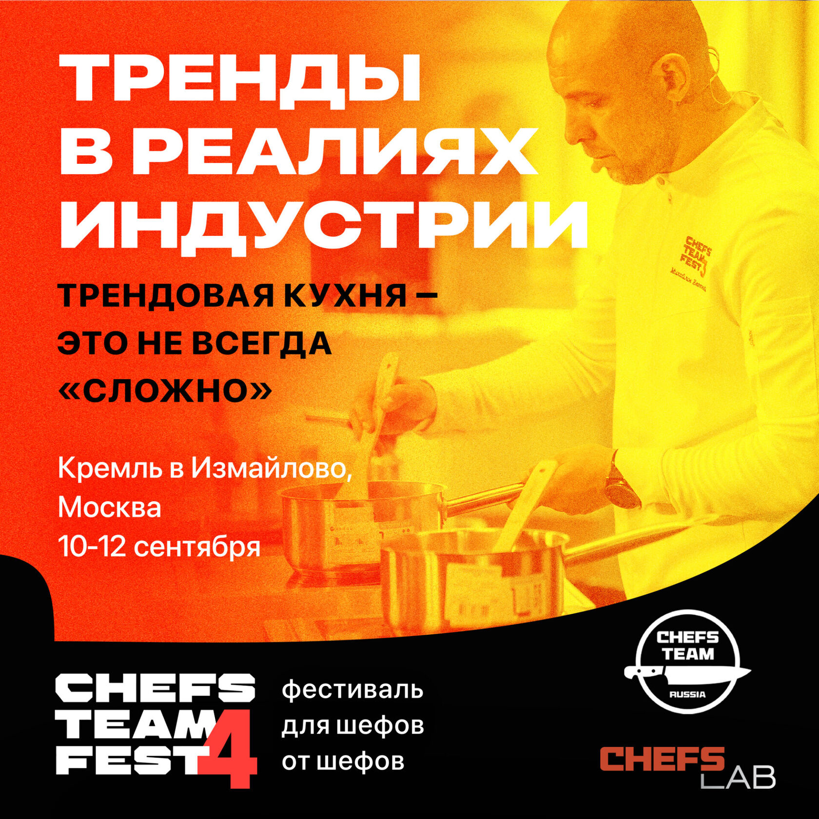 Программа и билеты на сайте проекта. | | | | | Шеф-повара раскроют секреты трендовой кухни | | 4-й гастрономический фестиваль для шеф-поваров и кондитеров CHEFS TEAM FEST 2024, пройдет в Москве 10-12 сентября 2024 года в Измайловском кремле. Организатором фестиваля выступает ассоциация шеф-поваров России «Chefs Team Russia», объединяющая более 2100 профессионалов.